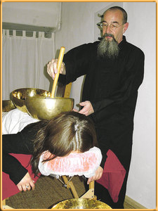 Empfangende liegt in der Regel auf dem Bauch, die Klangschalen werden